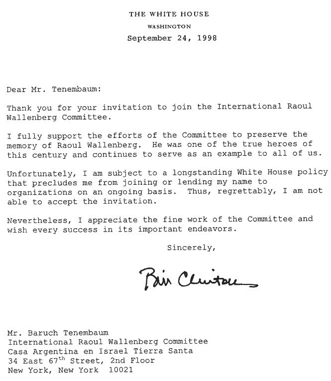 - Original letter from President Bill Clinton to Baruch Tenembaum
