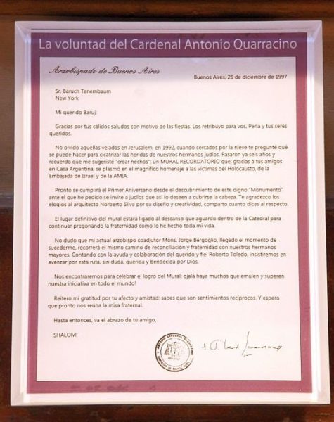 ”En memoria de nuestros hermanos judíos masacrados e inmolados durante la Shoah (Holocausto) y de los mártires de los atentados a la embajada de Israel en Buenos Aires y a la Asociación Mutual Israelita Argentina (AMIA). Homenaje del Arzobispo de Buenos Aires, Primado de la Argentina, Cardenal Antonio Quarracino, tributado el 14 de abril de 1997, en Buenos Aires, Argentina.”