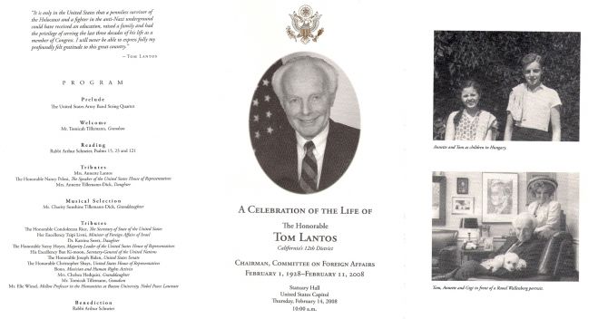 Fue una mañana repleta de historias personales. Historias sobre viajes a Budapest, sobre una visita a una base aérea junto a Tzipi Livni, canciller israelí, sobre el amor de Lantos por sus perros y su pasión por la música y su familia. El rabino Schneier, el senador Shays y los representantes Steny Hoyer y Nancy Pelosi recordaron que Lantos era un sobreviviente del Holocausto que había llegado a Estados Unidos sin un centavo pero lleno de pasión por la causa de los derechos humanos, gran amigo del Estado de Israel y el primer sobreviviente de la Shoá en convertirse en miembro del congreso.