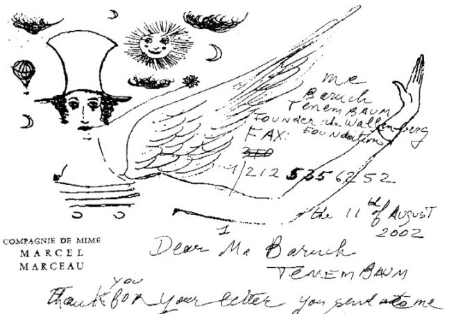 En agosto de 2002 Marceau escribió una carta dirigida a Baruj Tenembaum, creador de la Fundación Wallenberg. La misiva fue ilustrada con un dibujo del mimo, el mismo que ilustra esta nota y que se reproduce por primera vez.