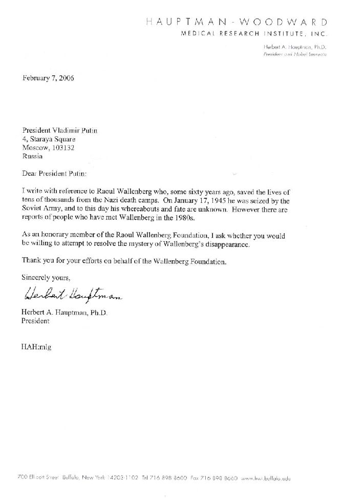 Estimado Presidente Putin:Le escribo en referencia a Raoul Wallenberg quien, hace unos 60 años atrás, salvó las vidas de decenas de miles de los campos de la muerte Nazi. En 17 de enero de 1945 fue detenido por el Ejército Soviético, y hasta el día de hoy se desconoce su paradero y su destino. Sin embargo, existen informes de personas que se han encontrado con Wallenberg en los años ’80.