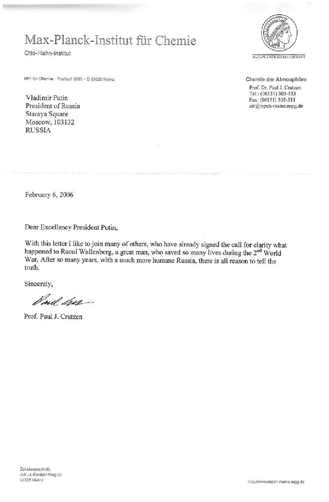 Con esta carta quiero unirme a todos quienes han firmado la campaña para esclarecer el destino de Raoul Wallenberg, un gran hombre, quien salvó muchas vidas durante la Segunda Guerra Mundial.