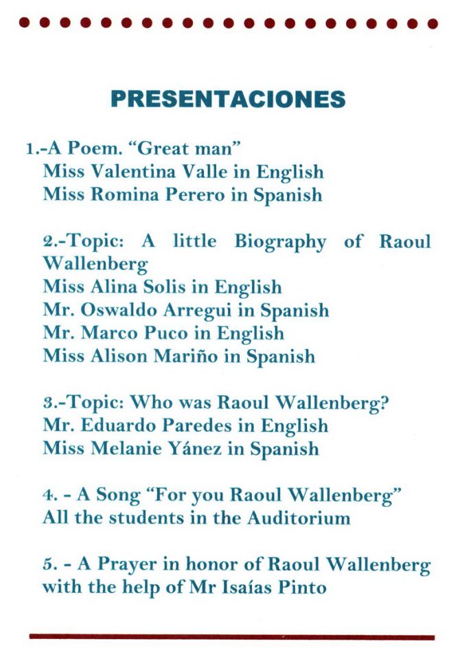 Al final de programa el vicerrector hizo junto con el apoyo de todos los presentes una oración en honor a ese gran héroe de la segunda guerra mundial: Raoul Wallenberg.