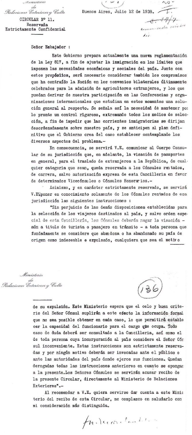 It was about secret law number 11, one of the very most secret under the custody of the Argentine State, an order signed in 1938 by then Foreign Minister José María Cantilo and sent to each Argentinean delegation around the world, with the purpose of preventing Jews and other people persecuted by the Nazis from entering Argentina.