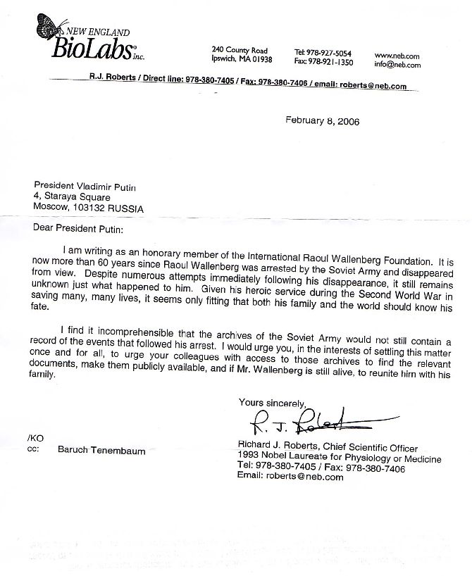 ”I find it incomprehensible that the archives of the Soviet army would not still contain a record of the events that followed [Wallenberg’s] arrest,” writes Richard J. Roberts, chief scientific officer of New England Bio Labs, 1993 Nobel Laureate for Physiology or Medicine, and also a member of the IRWF. ”I would urge you, in the interests of settling this matter once and for all, to urge your colleagues with access to those archives to find the relevant documents, make them publicly available, and if Mr. Wallenberg is still alive, to reunite him with his family.”