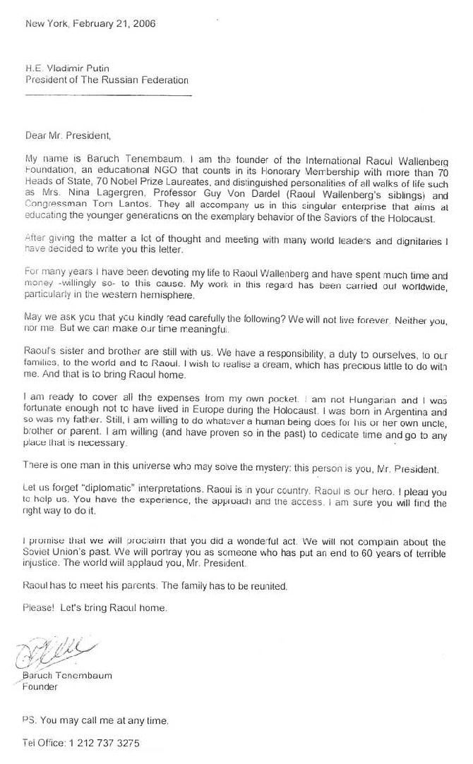 Thursday, February 17, 2006. The International Raoul Wallenberg Foundation reaches out to its some 200 members, who include Heads of State and Nobel Laureates and to all individuals urging them to send letters to the President of Russia, Vladimir Vladimirovich Putin, asking him to resolve Raoul Wallenberg’s mystery. Within a few weeks, copies of letters sent to the office in Russia have been pouring in and all have been diplomatic and forthright.