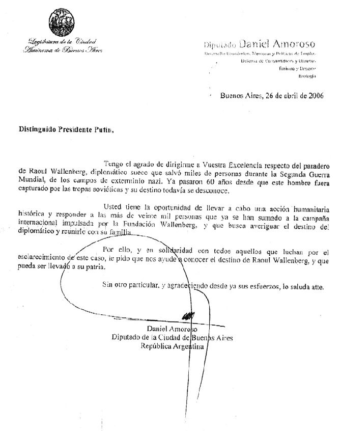 I write to you with regard to the fate of Raoul Wallenberg, the Swedish diplomat that saved thousands of people condemned to death during the Second World War. Sixty years have gone by since this man was captured by the Soviet Army and his fate is still unknown.