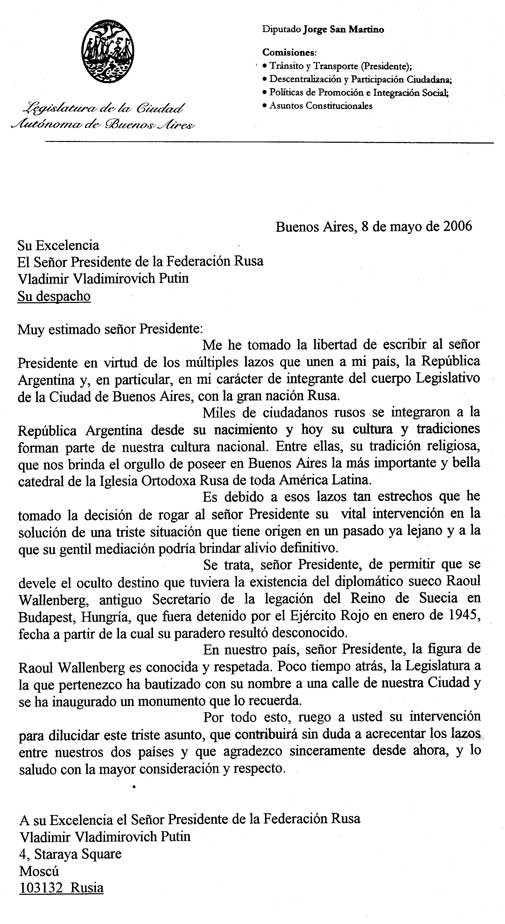 Letter from Jorge San Martino, Buenos Aires City Congressman