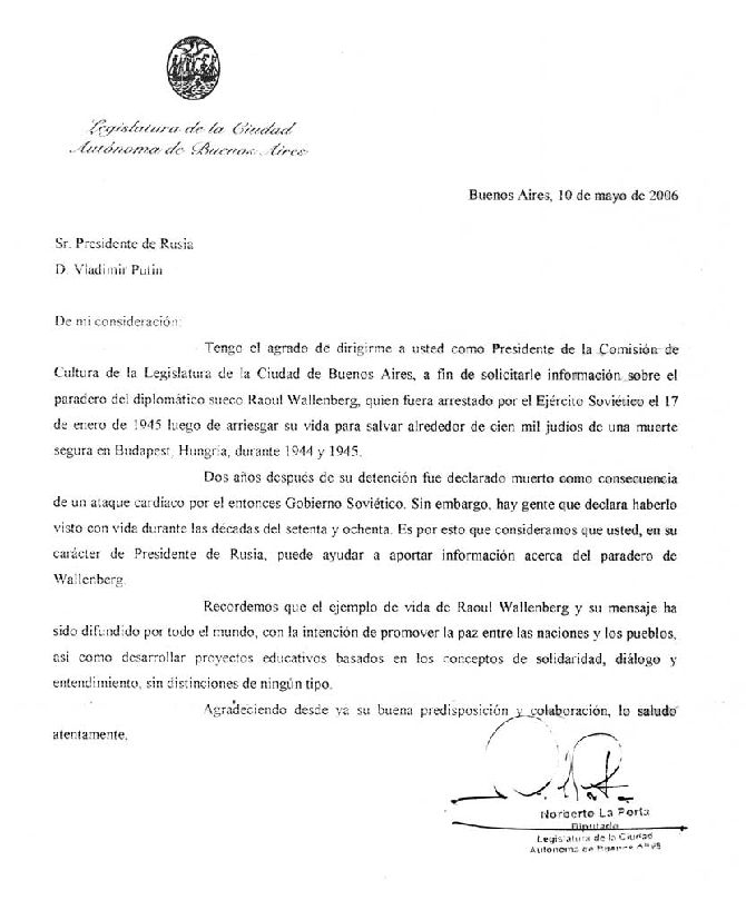 I am pleased to address you in my capacity of President of the Culture Commission of the Congress of Buenos Aires. I would like to asky you forr information regarding the whereabouts of the Swedish diplomat Raoul Wallenberg. As of today, we know that he was arrested by the Soviet Army on January 17th, 1945, after risking his life in order to save approximately one hundred thousand Jews from a certain death in Budapest, Hungary, during 1944 and 1945.