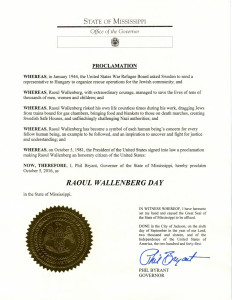 For the first time, the State of Mississipi joins the proclamation of October 5, 2016 as Raoul Wallenberg Day with the signature of Governor Phil Byrant, to whom we are truly grateful.