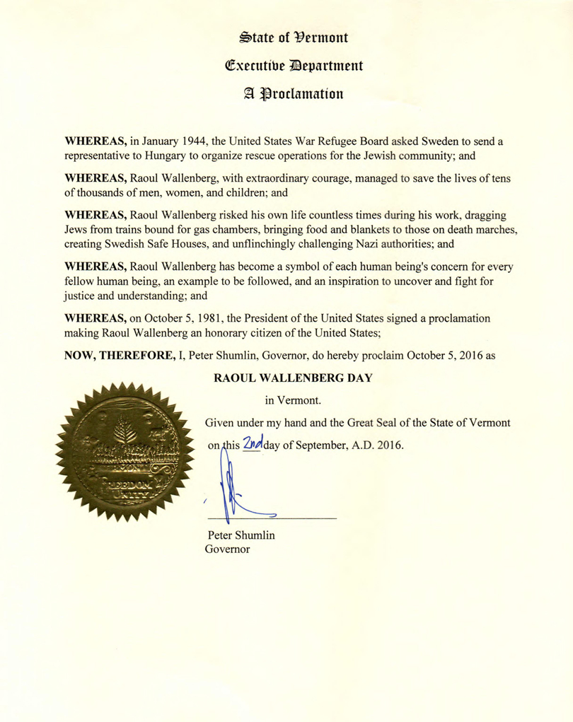 2016. Proclamation of Raoul Wallenberg Day in Vermont.